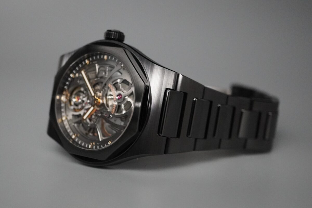 この時計を制作する際、ジラール・ぺルゴはセラミック素材を採用。この素材はスチールの7倍の硬さを持ち、高い耐傷性を備えています。
