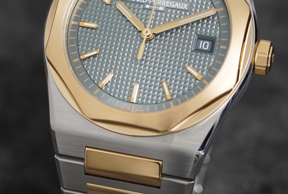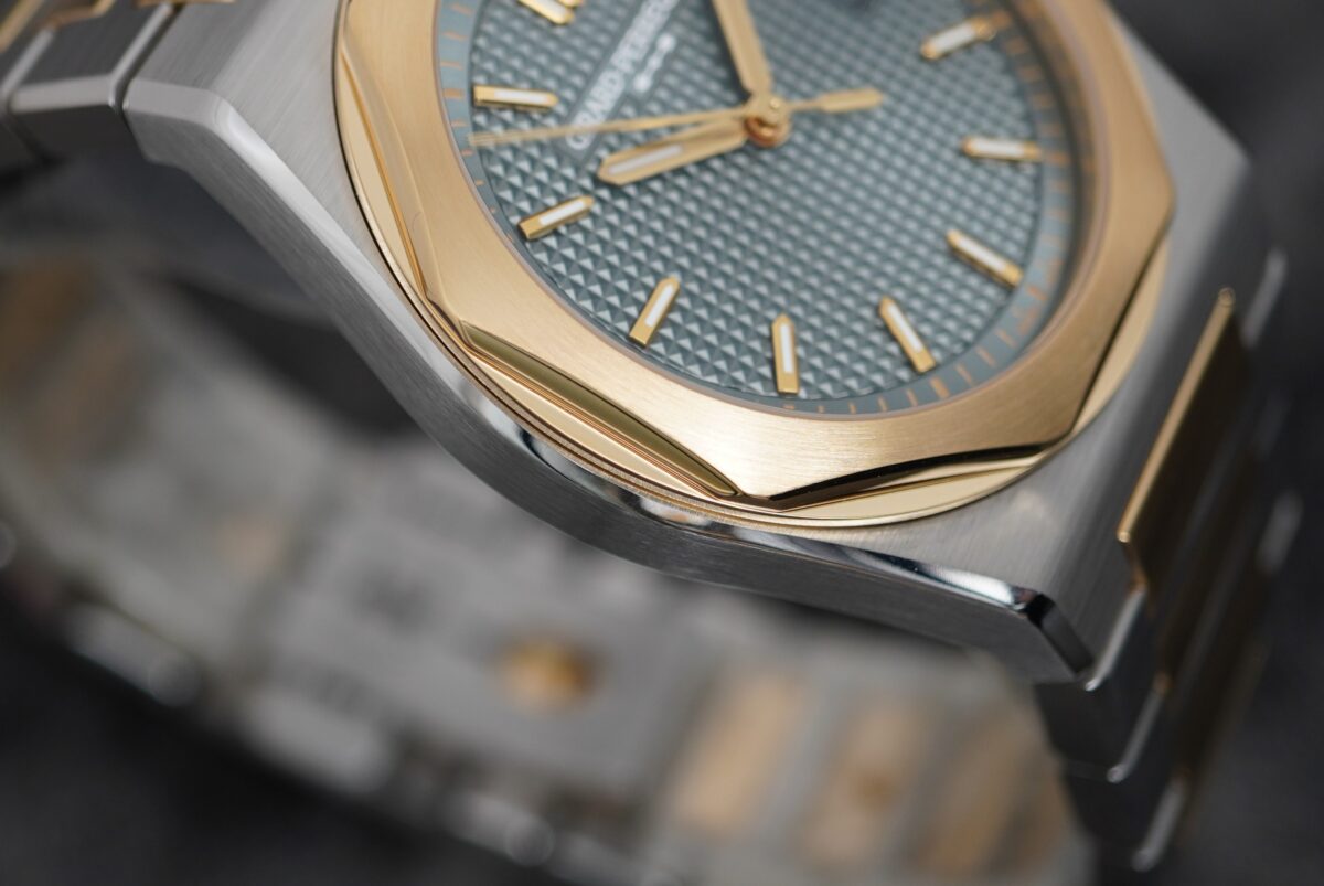 リュウズも違いがあります、現行ロレアートはリュウズの頭(GPロゴが入っている部分)が八角形でつまむ部分は細かな刻みが入っています。