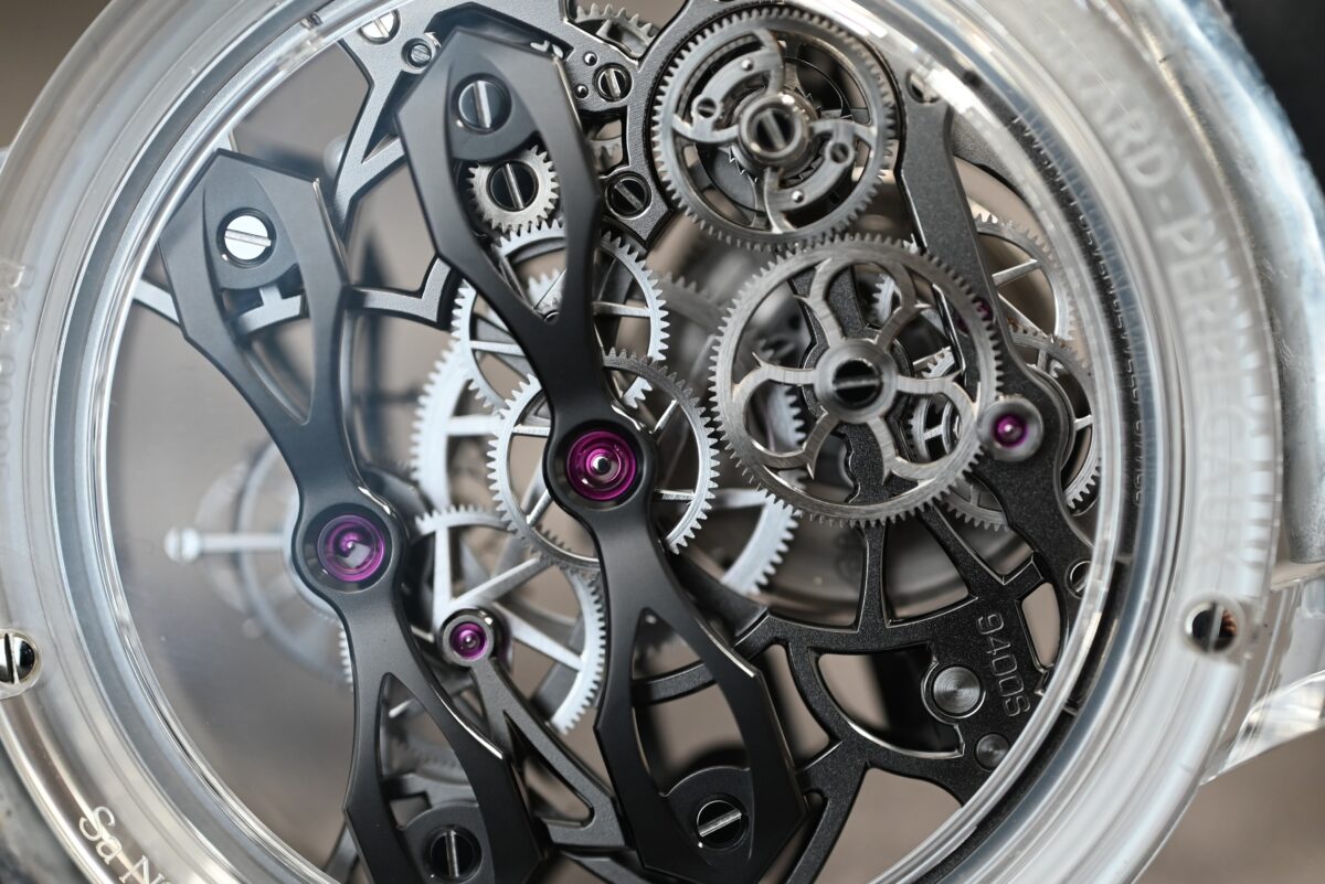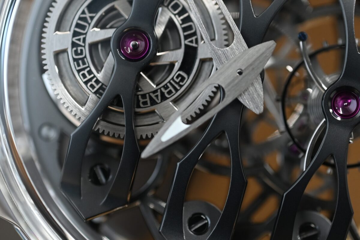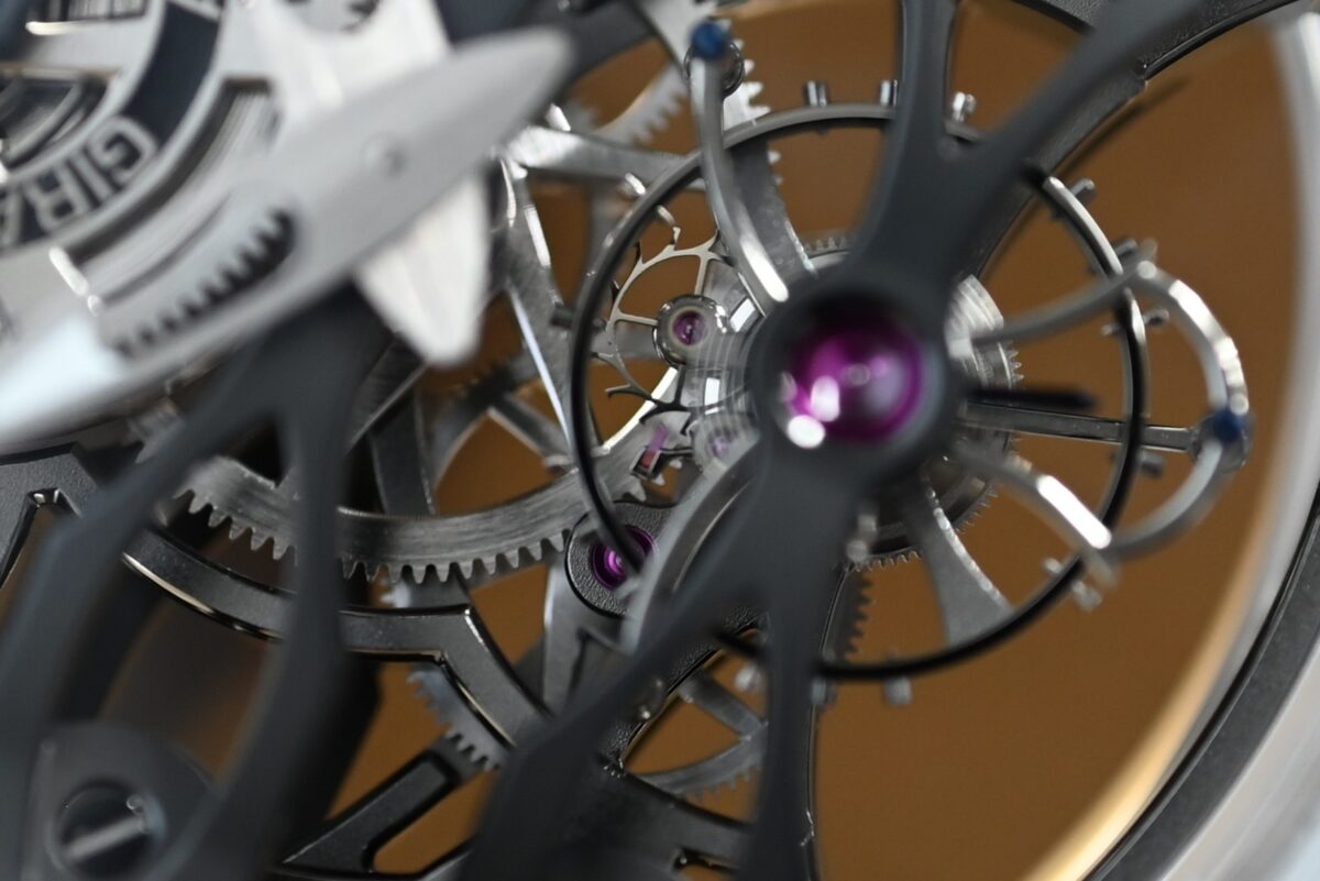 Cal.09400の地板を取り去った、GP09400-1035は真空状態になっているようでムーブメントが無重力状態に見えます(浮いているようにも見える)
