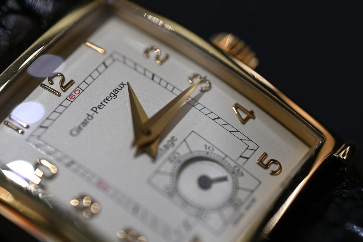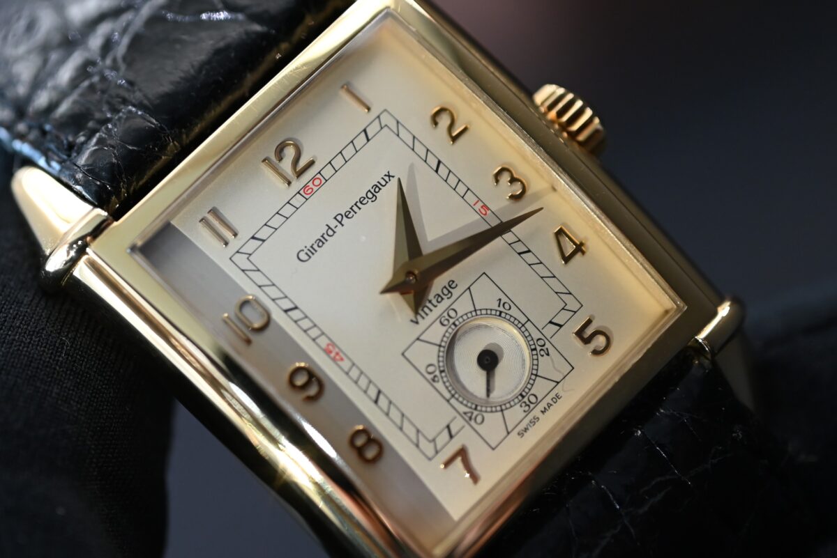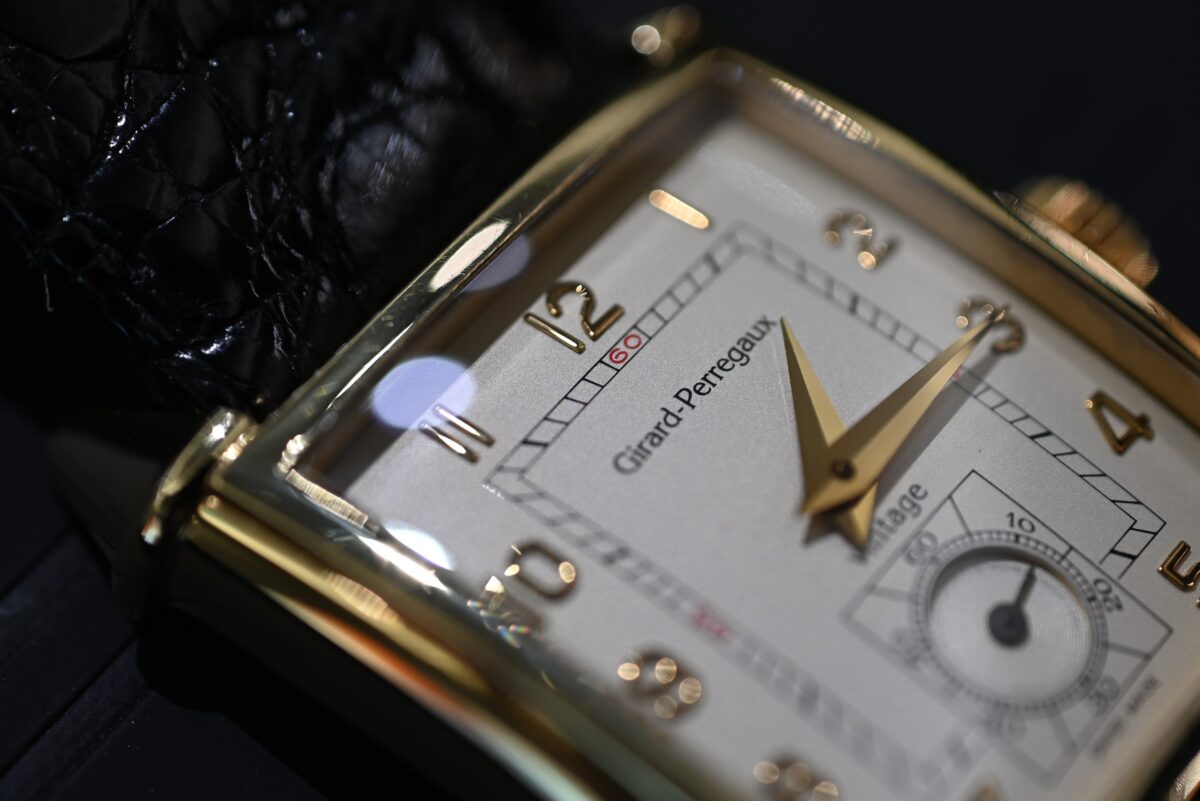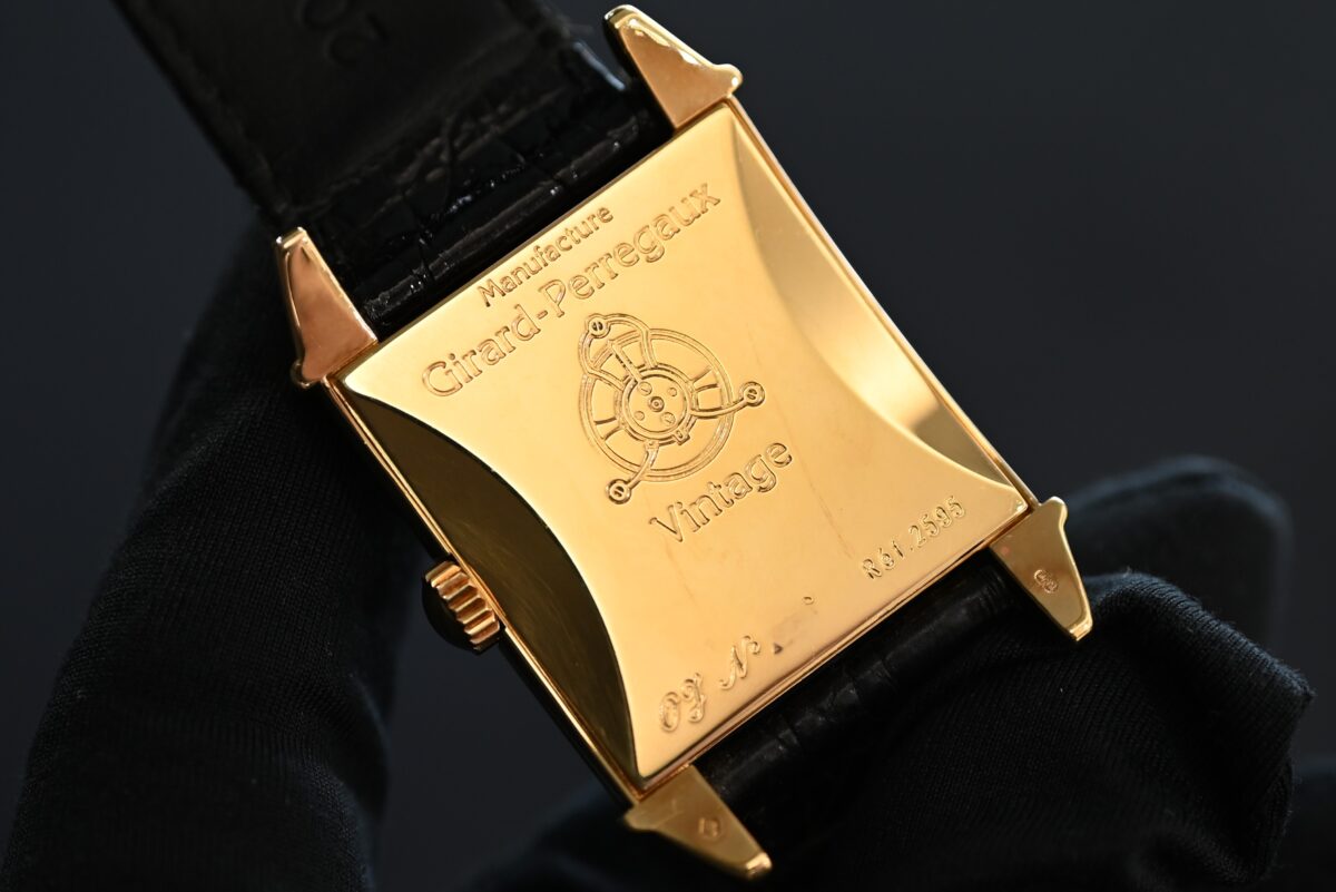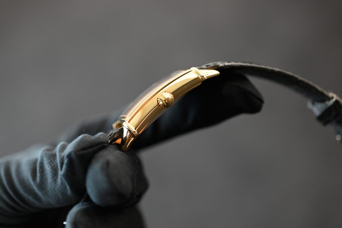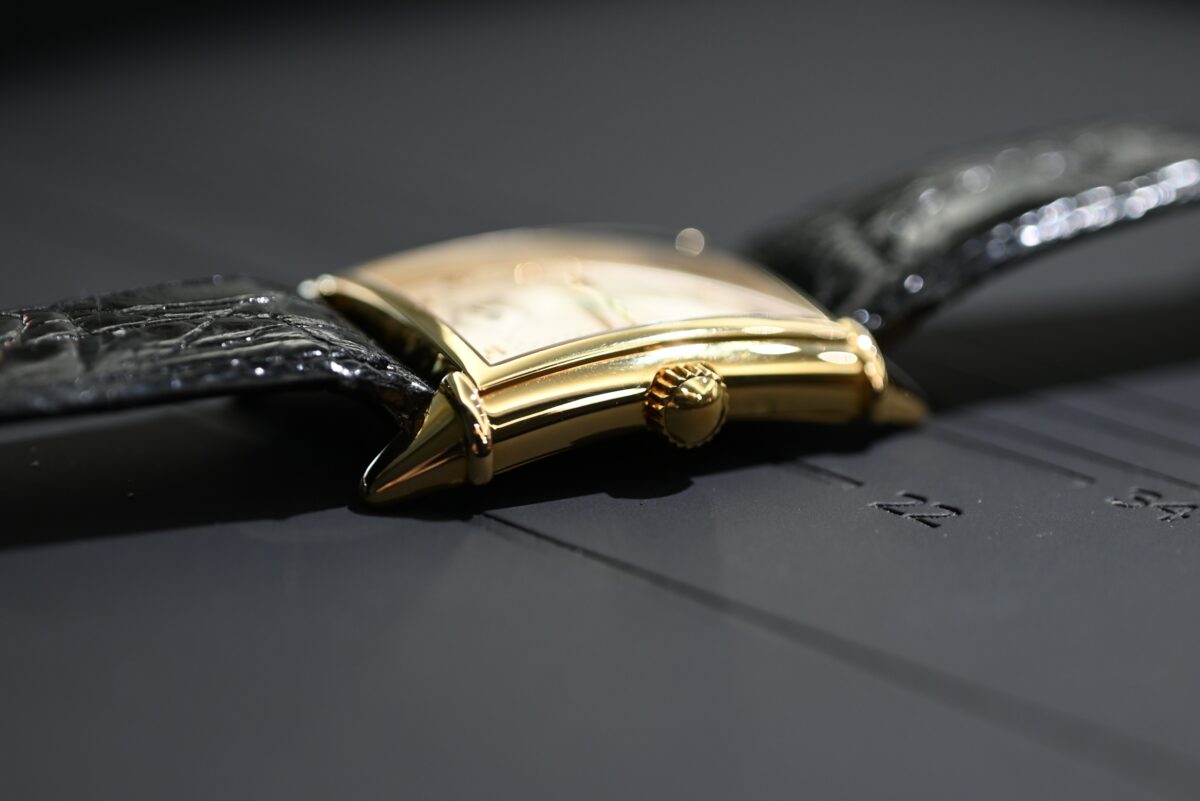「ヴィンテージ 1945」の最も特徴的な点は、腕に沿うように大きく湾曲したケースと太いケースラグです。これにより、角型でありながらも装着感が良く、他の時計にはないオリジナリティを生み出しています。この曲線と直線のバランスは、20世紀初頭の美意識を受け継いだジラール・ペルゴならではのこだわりです。