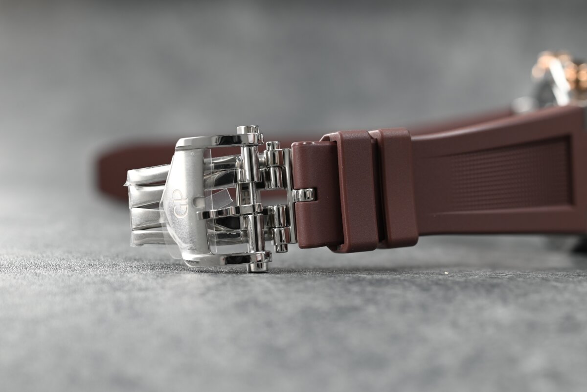 裏蓋はサファイアクリスタル仕様になっているため、自社ムーブメントであるGP03300の仕上げをじっくりと眺めることができます。