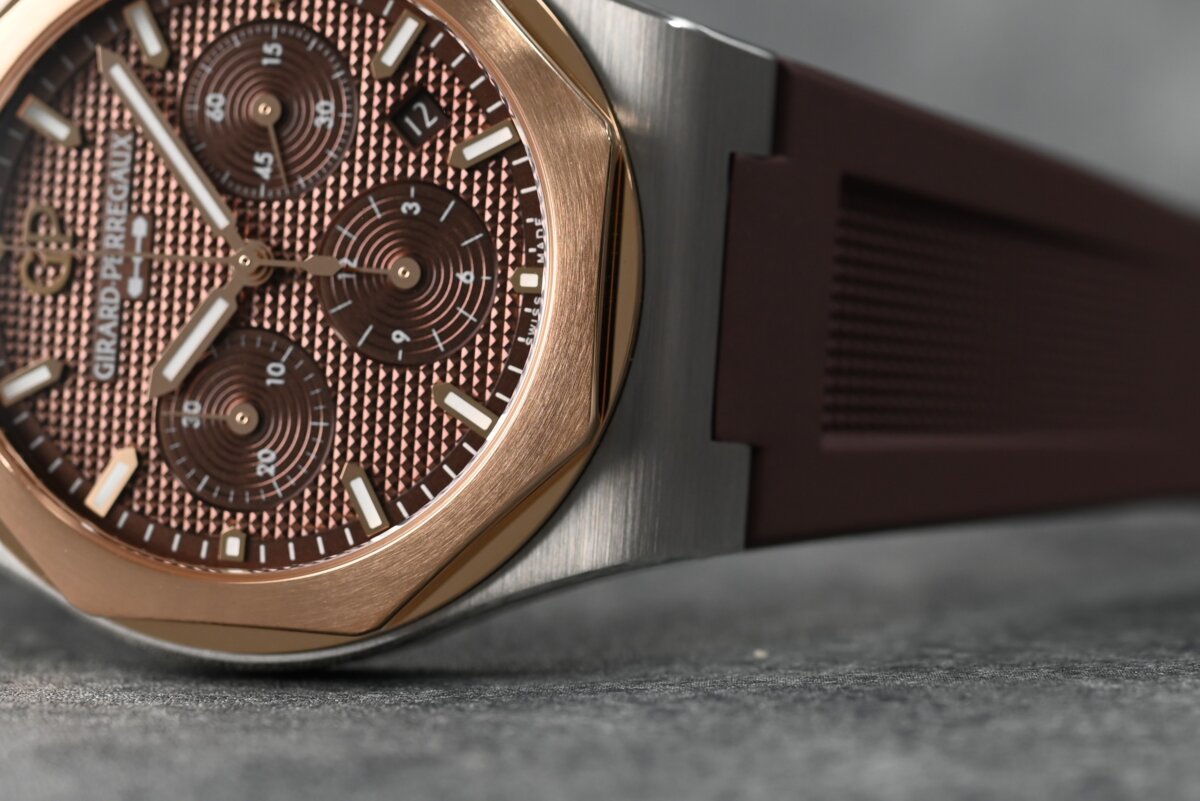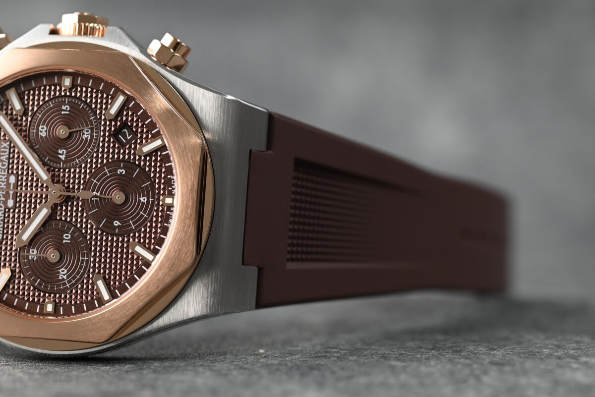 ブラウン文字盤は、ピンクゴールドのベゼルと美しく調和しコンビでしか出せない雰囲気に。